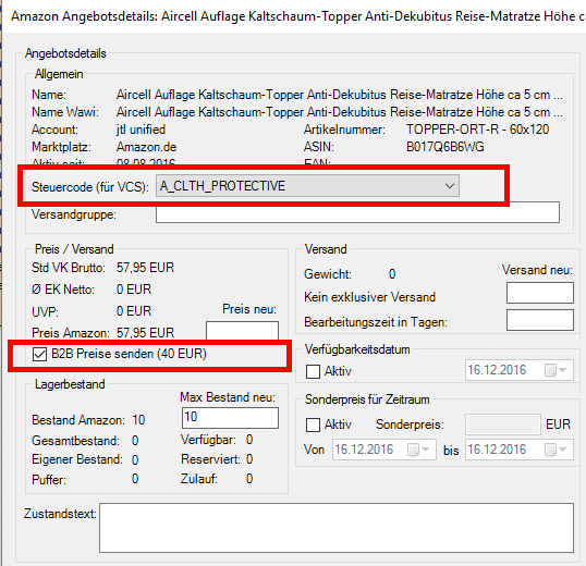 • Hier könnt ihr nun für das jeweilige Amazon-Angebot euren Steuercode angeben, wenn er vom globalen Steuercode in eurem Amazon-Konto abweicht.