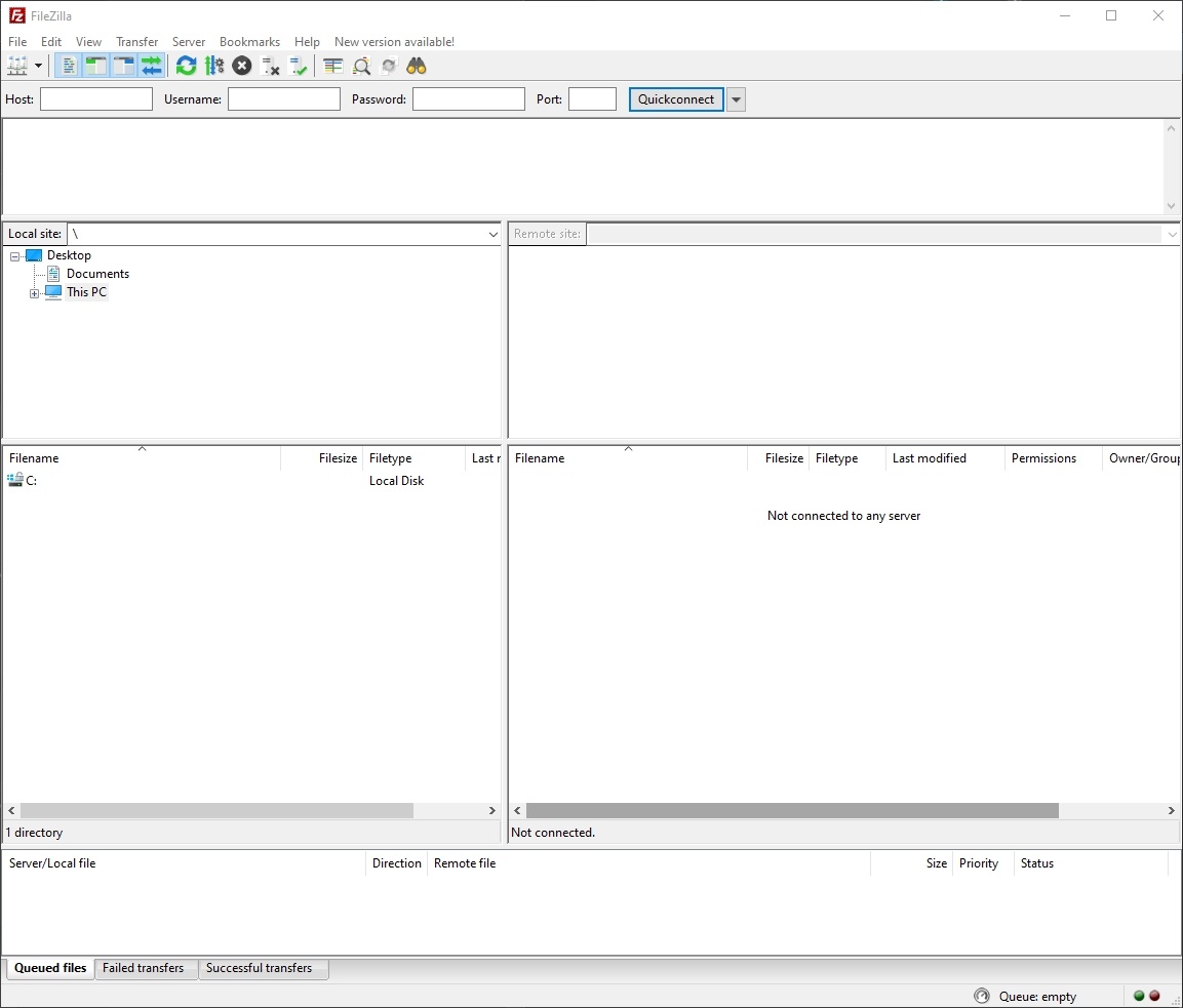 Nach dem Start von FileZilla sehen Sie folgenden Screen: