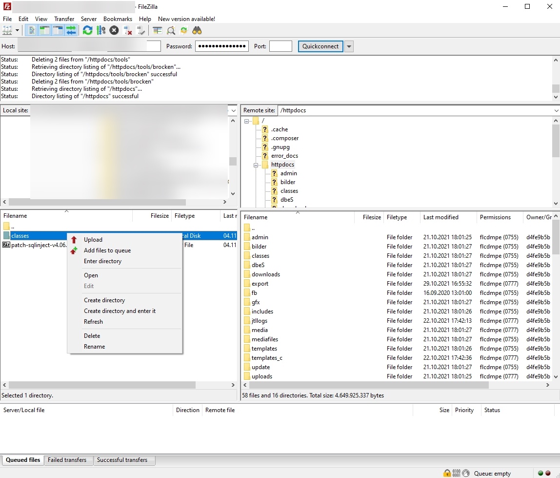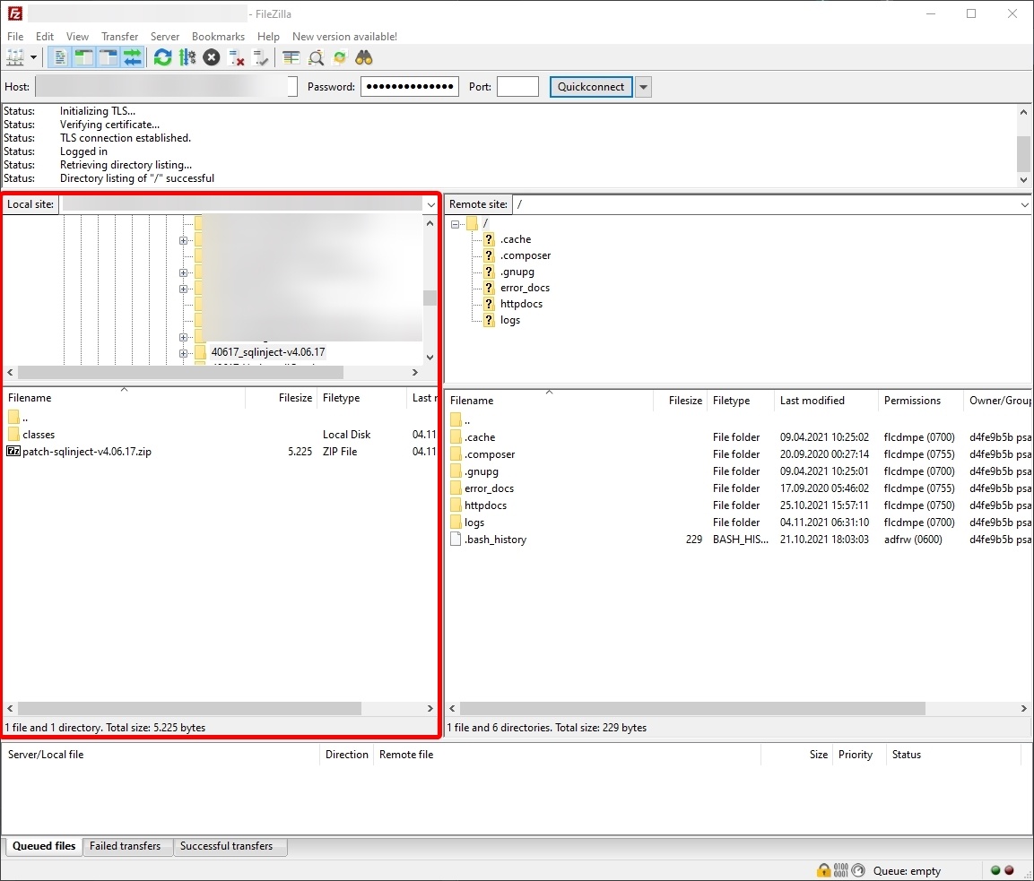 Haben Sie die Zugangsdaten hinterlegt und sich erfolgreich verbunden, sehen Sie auf der linken Seite die Dateistruktur ihres eigenen Rechners. Navigieren Sie hier zu dem Downloadverzeichnis des Patches: