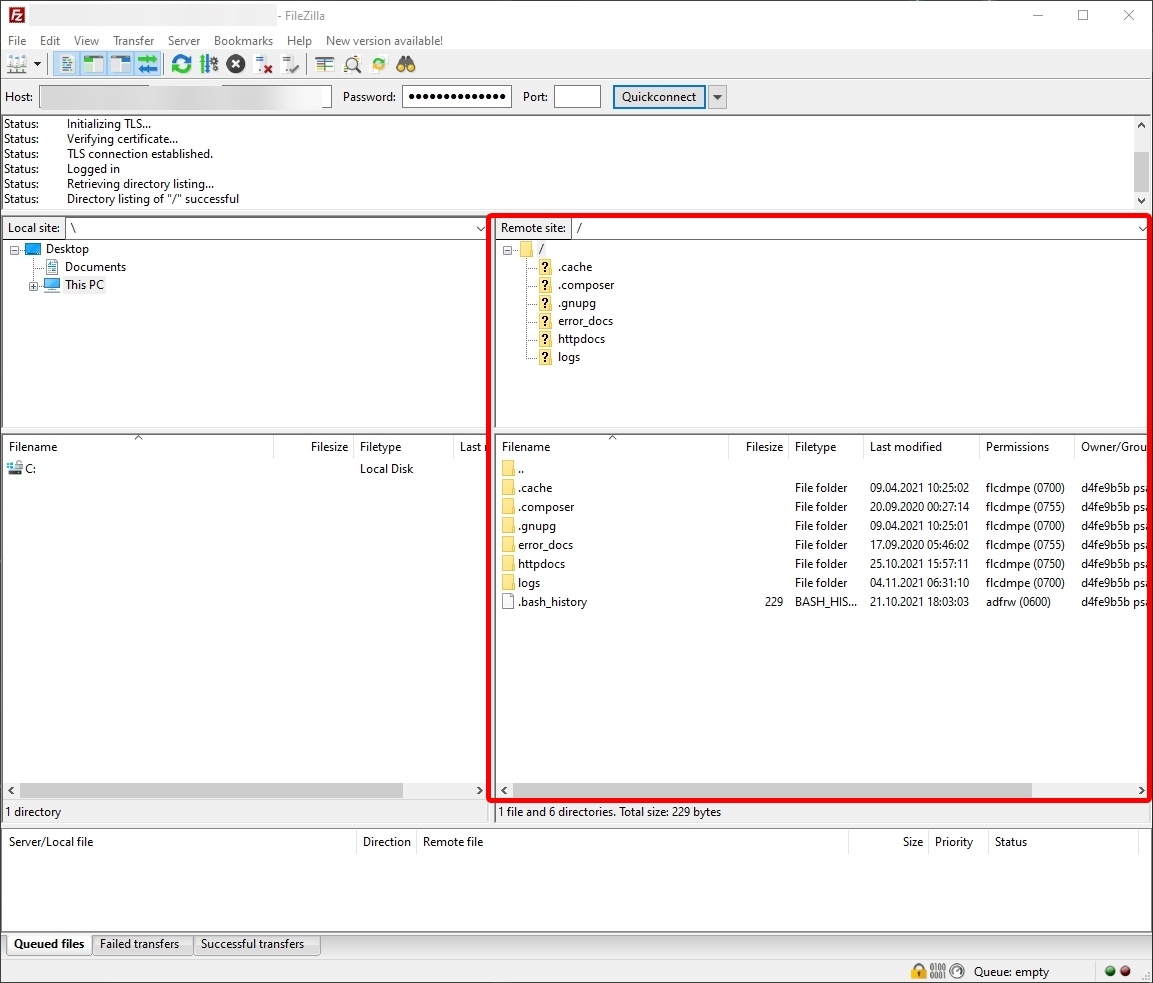 Links oben bei „Host“, „Username“, „Passwort“ und „Port“ müssen Sie Ihre FTP-Zugangsdaten eintragen. Sollten Ihnen diese nicht vorliegen, kann Ihr Hosting-Dienstleister helfen. Große Hoster bieten häufig auch Guide/FAQ-Einträge an, in denen der Vorgang beschrieben wird.