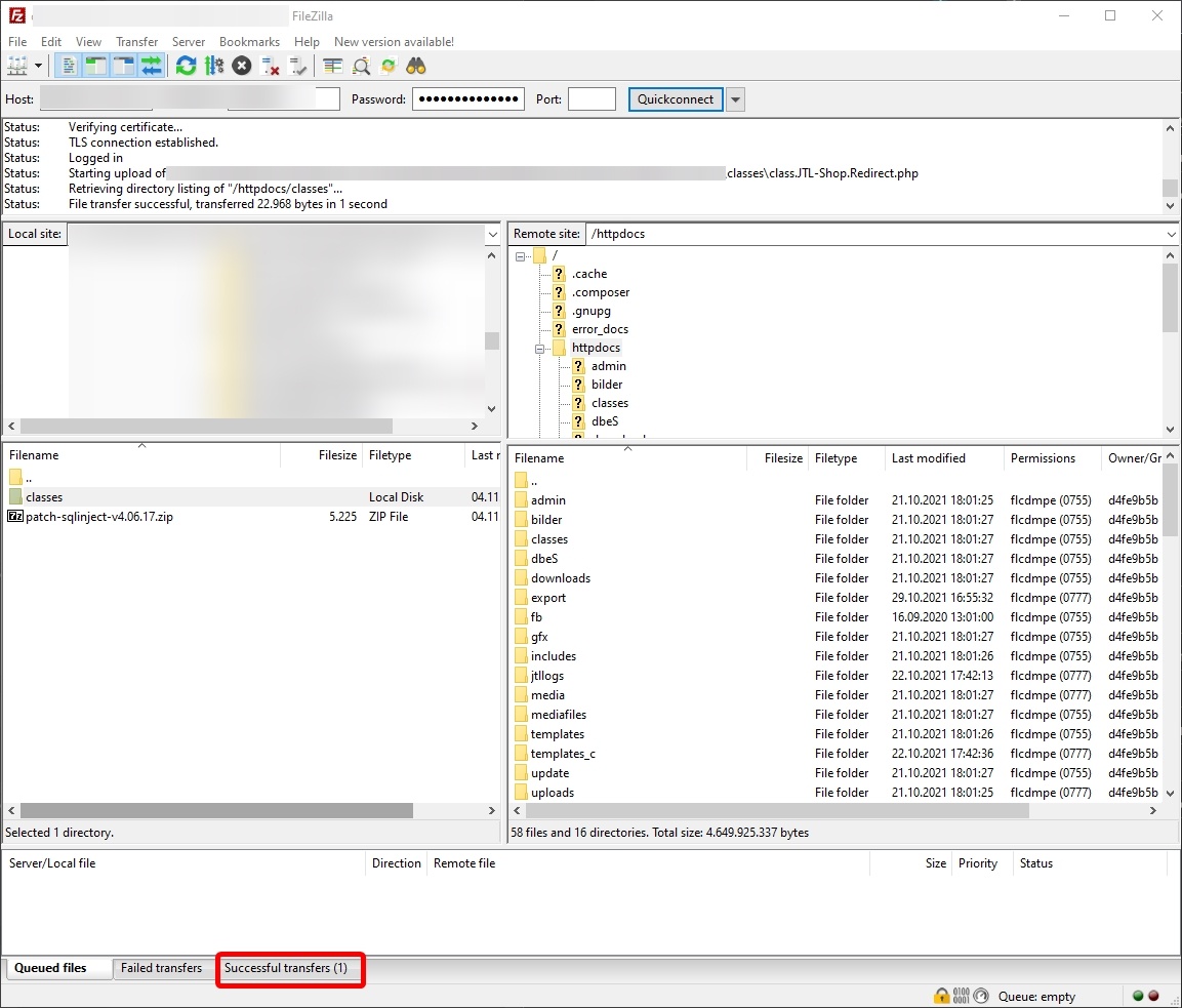 Die Datei wird nun hochgeladen. Achten Sie darauf, dass die Übertragung auch bei den erfolgreichen Übertragungen steht. Sollte dies nicht der Fall sein, versuchen Sie es erneut. Sollte es nicht klappen, bitten Sie Ihren Hoster um Unterstützung.