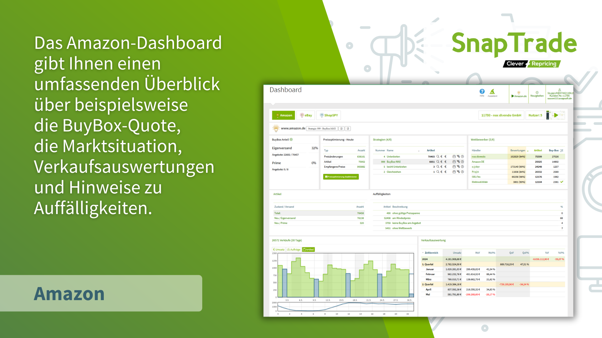 Mit SnapTrade bietet die SnapSoft GmbH seit 2013 intelligente Repricing- und Analysetools an. Die webbasierte Lösung optimiert Ihre Verkaufspreise auf Amazon, eBay und im eigenen Onlineshop auf Basis der aktuellen Marktlage. Dabei werden alle wichtigen Wettbewerbs- und Verkaufsanalysen übersichtlich dargestellt. Durch die REST-API benötigen Sie keine zusätzliche Software, sonder SnapTrade lässt sich in Ihre bestehende Systemlandschaft ganz einfach integrieren.