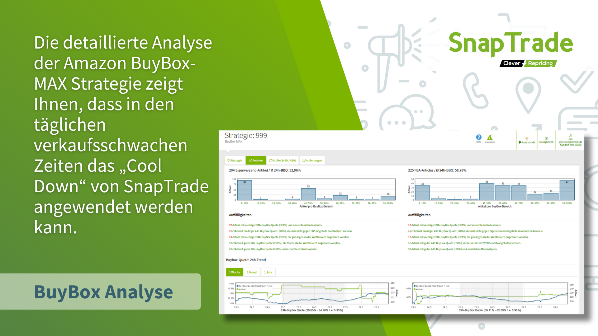 SnapTrade optimiert und analysiert die Preise auf allen internationalen Amazon-Marktplätzen in Echtzeit. Clevere Stratiegien beugen Preisdumping vor und ermitteln den besten BuyBox-Preis, sodass Sie sich gegen Ihre Wettbewerber durchsetzen können. Mit integrierten Analysen behalten Sie Wettbewerber im Blick und können Ihren Onlinehandel strategisch ausrichten.