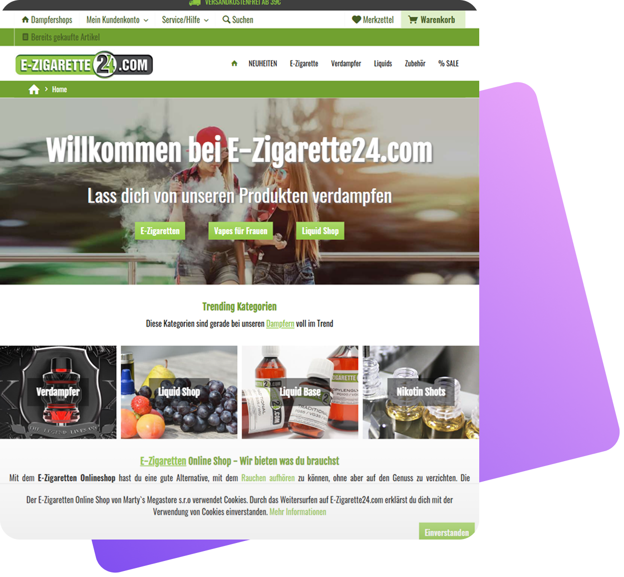 Als wir die erste Filiale von Marty’s Megastore in Wien eröffnen, sind wir einer der ersten Anbieter von E-Zigaretten, Liquids und Zubehör. Parallel zum Ladengeschäft geht unser mit Magento betriebener Webshop e-zigarette24.com online. Beide Verkaufswege verlaufen erfolgreich – so erfolgreich, dass wir nach zwei Jahren an Kapazitätsgrenzen stoßen.
