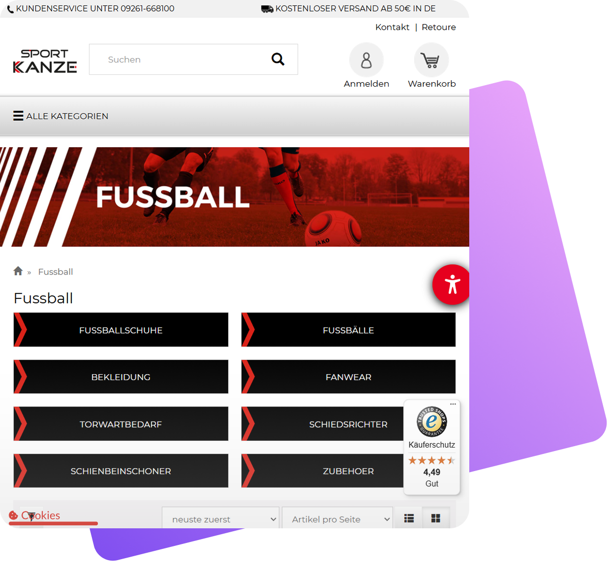 Der Schwerpunkt unseres Angebotes liegt mittlerweile klar im Bereich der Sportartikel, vorzugsweise für Teamsportarten. Über 30.000 Artikel bekannter Hersteller schmücken derzeit unseren JTL-Shop und sorgen für zufriedene Kunden. Insbesondere Vereine werden in unseren Sortimenten schnell fündig und finden interessante Specials.